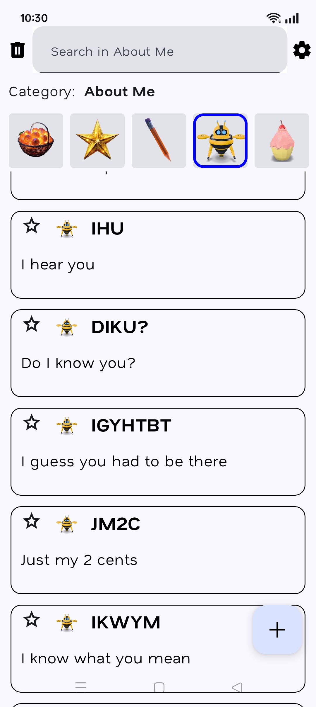 - The 1,000 sentences are divided in 9 categories by function of its natural use: “All” (the 1,000 sentences); “Created” (your own lingos and texts); “About Me” (e.g. AISI, As I see it); “For You” (e.g. YSK, You should know); “Greetings & Farewells” (e.g. SYL, See you later); “Place & Time” (e.g. OOO, Out of office); “Love” (e.g. ILYVM, I love you very much); “Sayings” (e.g. HTNOTH, Hit the nail on the head); “Various” (e.g. SOK, It's OK).